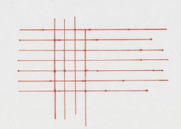 Auf den Fronten des Sideboards springen Punkte von oben nach unten und Linien verbinden diese miteinander - ein grafisch, lebendiges Spiel entsteht in den Zwischenräumen der Türen, die sich die Griffe untereinander Teilen und unterschiedlich großen Stauraum bilden. Die Räume zwischen den Türen sind das gestaltgebende Element des Sideboards.