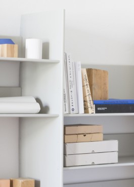 Die variablen Böden aus Aluminiumblech stabilisieren das Gefüge und bilden durch ihre unterschiedlich hohen Rückwände ein lebendiges Farbraster, das den Inhalt des Regals besonders in Szene setzt und deutlich von der Wand abhebt.